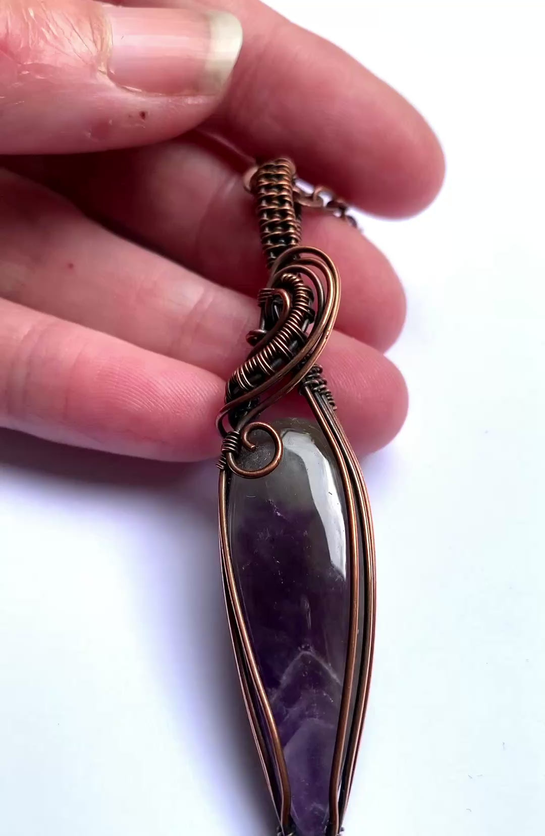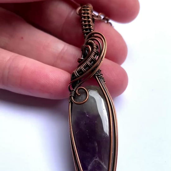 Hand wrapped in copper wire and oxidised to create an antique patina.