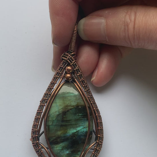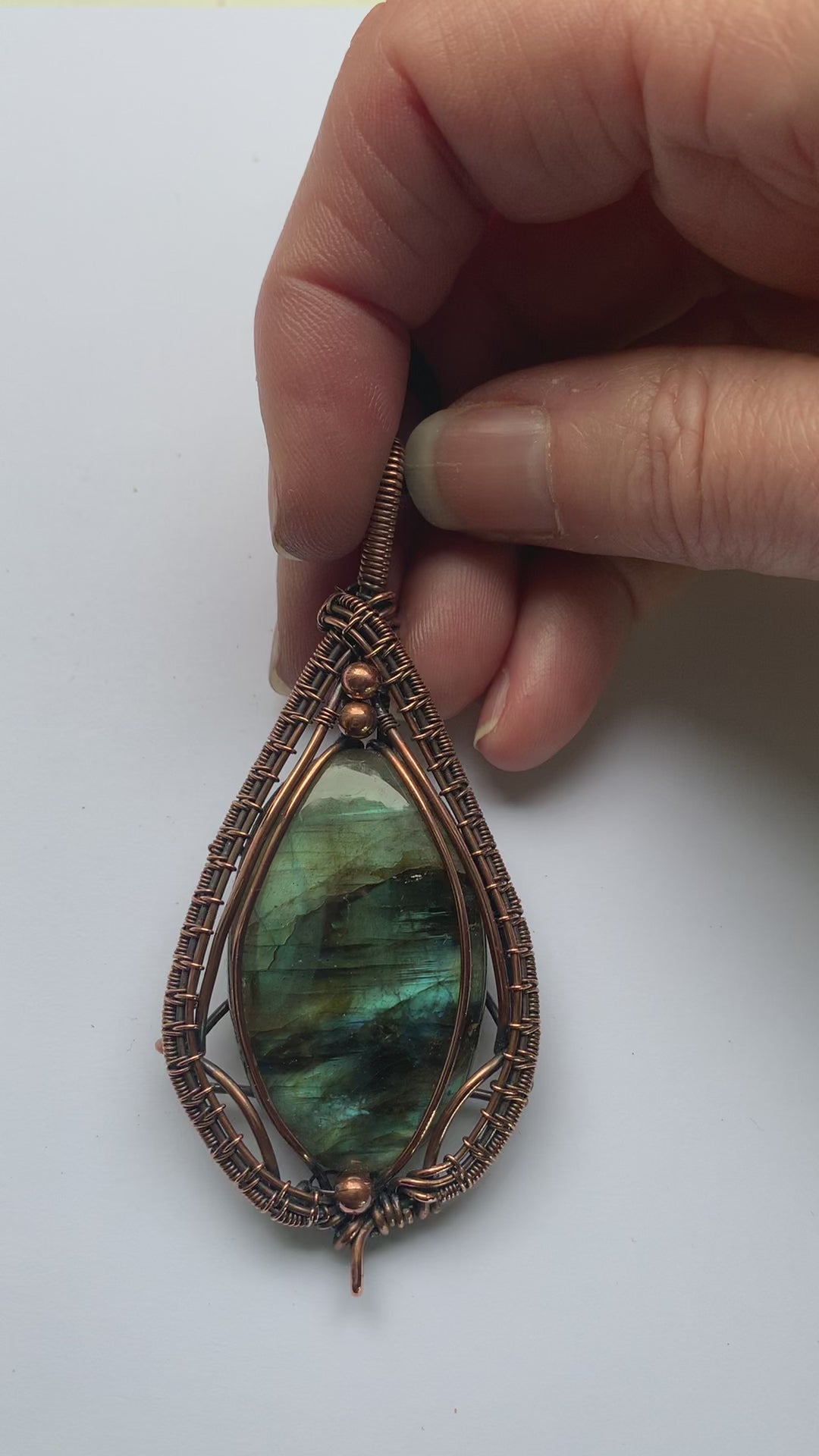Hand wrapped in copper wire and oxidised to create an antique patina.