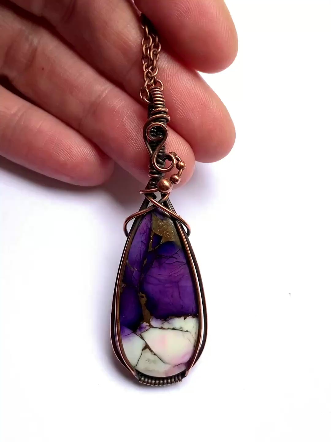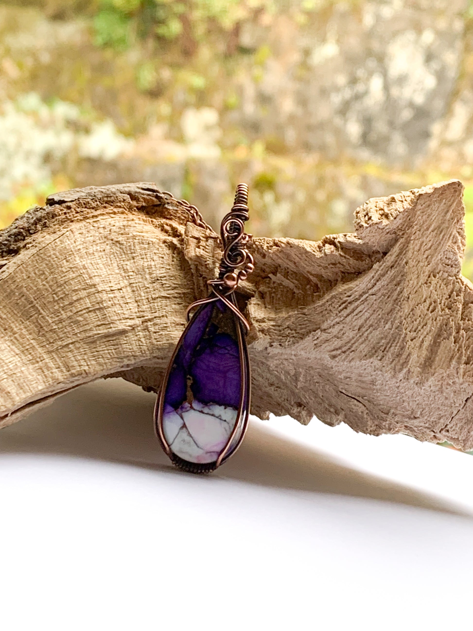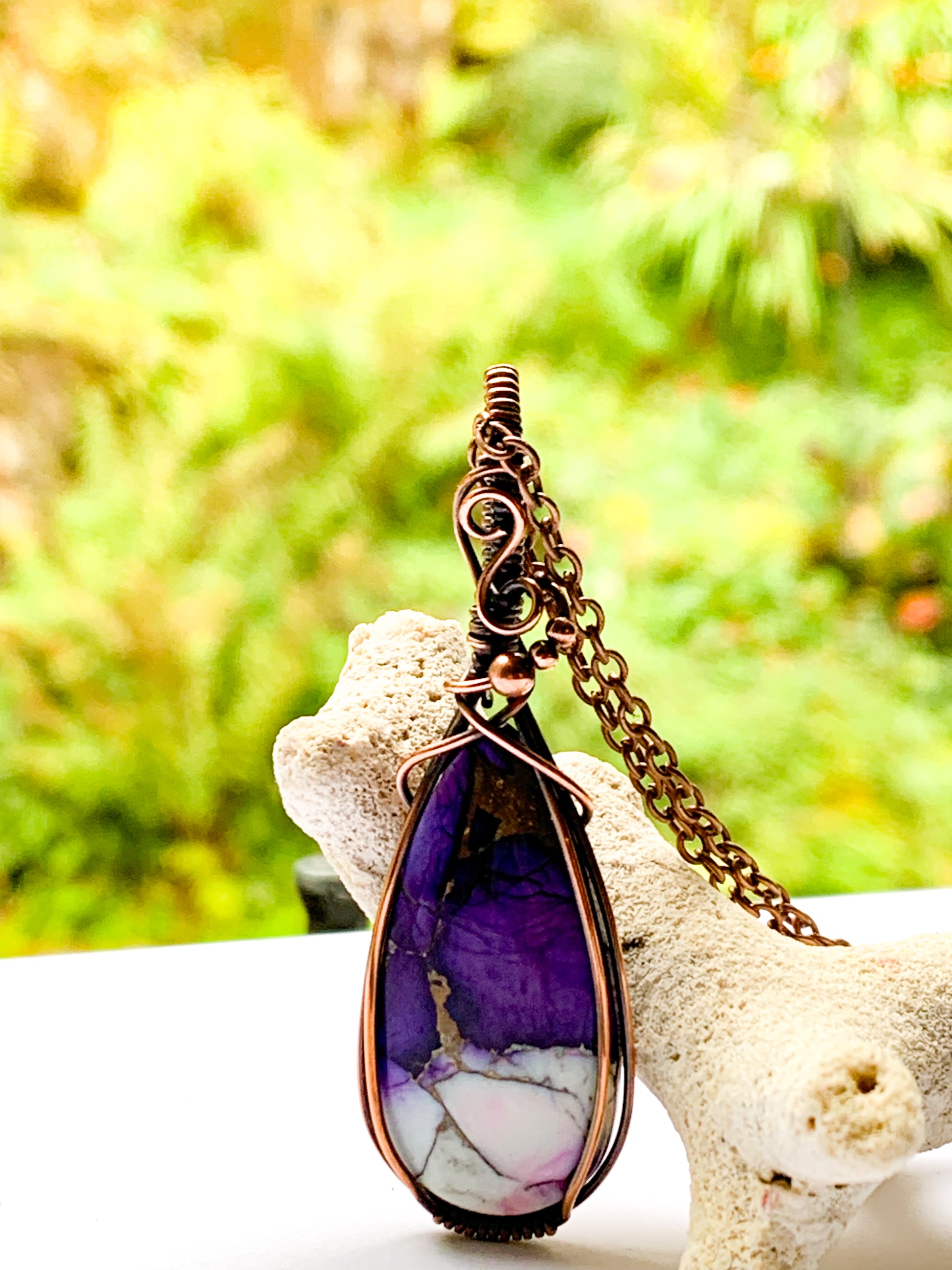 Hand wrapped in copper wire and oxidised to create an antique patina.